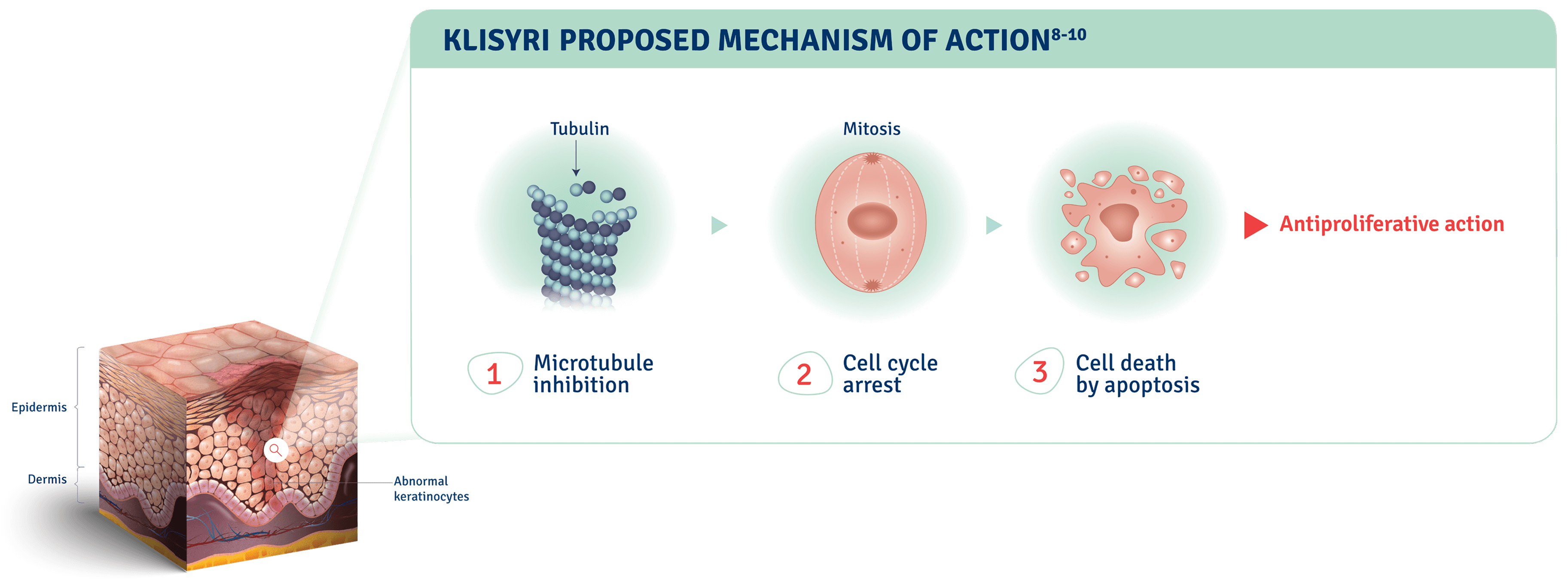 See Microtubule Inhibition in ActionThe mechanism of action of KLISYRI for the topical treatment of actinic keratosis is unknown.1