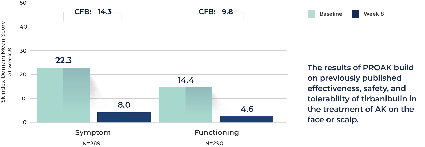 The Skindex-16 survey was used to comprehensively assess the impact of tirbanibulin on health-related QoL.